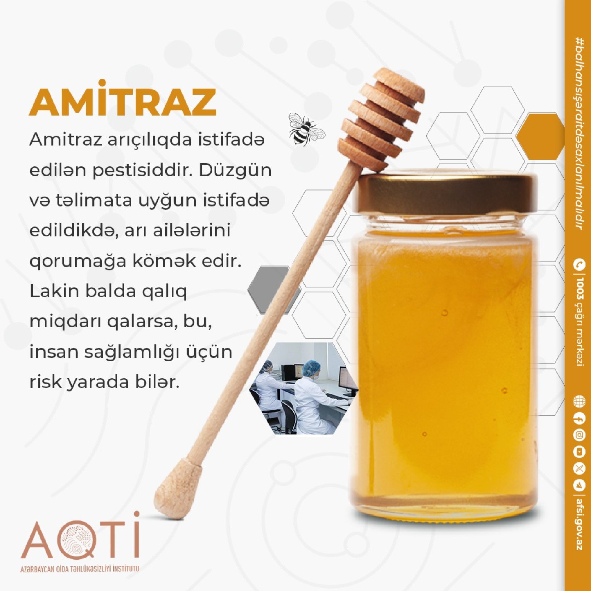 Balın arıçılıqda istifadə edilən pestisid olan amitrazla bağlı müayinələri də aparılır. Amitraz düzgün və təlimata uyğun istifadə edildikdə, arı ailələrini qorumağa kömək göstərir. Lakin balda qalıq miqdarı qalarsa, bu, insan sağlamlığı üçün risk yarada bilər.