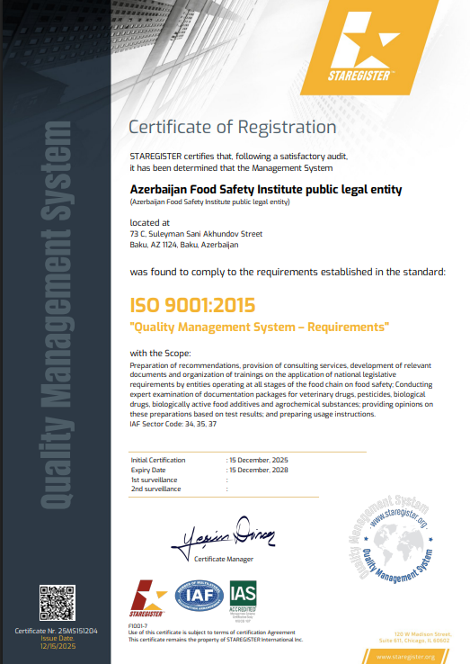 Azərbaycan Qida Təhlükəsizliyi İnstitutu (AQTİ) ISO beynəlxalq standartlarına uyğun sertifikatlaşdırılıb. Keçirilmiş auditin nəticələrinə əsasən institut ISO 9001:2015 “Keyfiyyət İdarəetmə Sistemi. Tələbləri” standartına uyğunluq sertifikatı alıb.