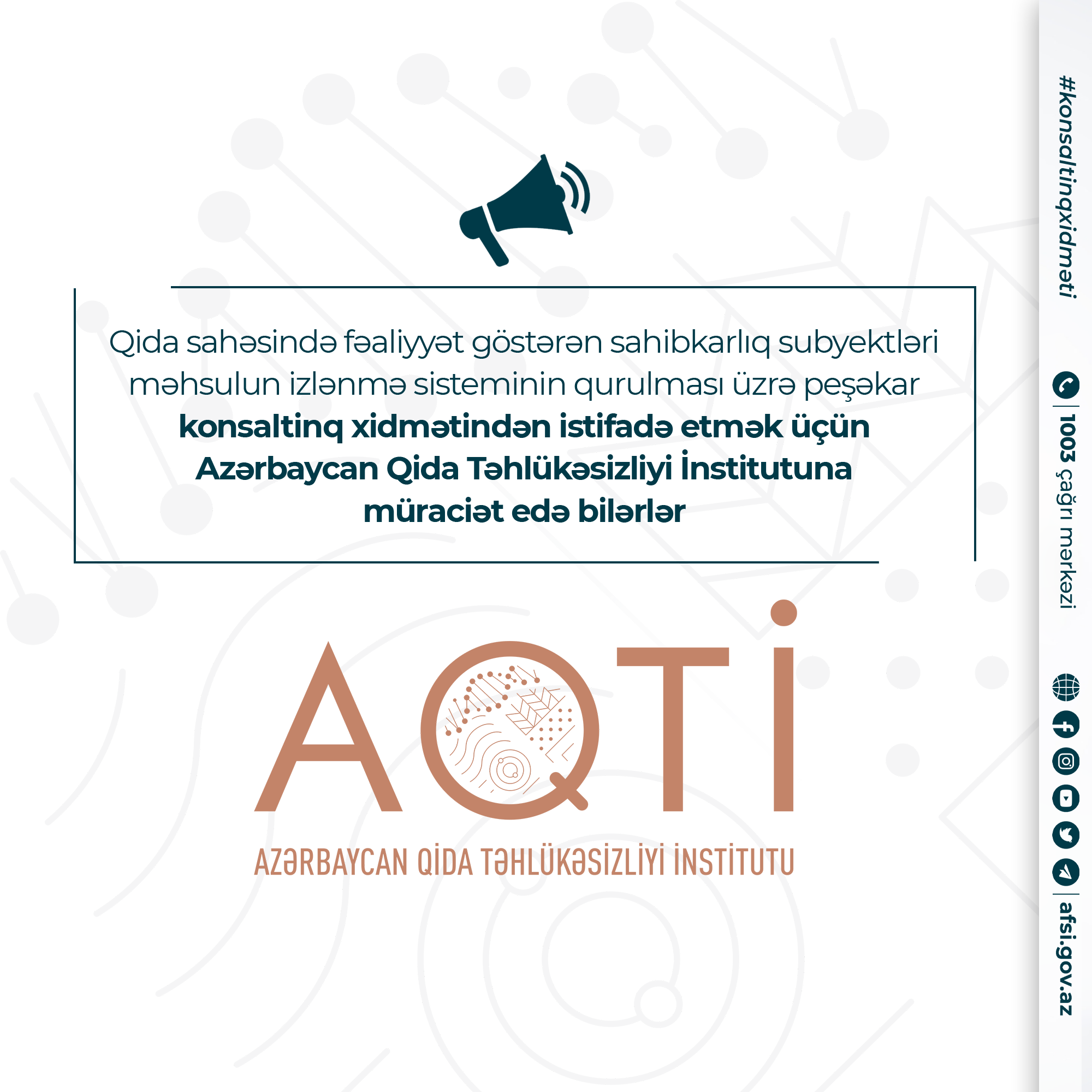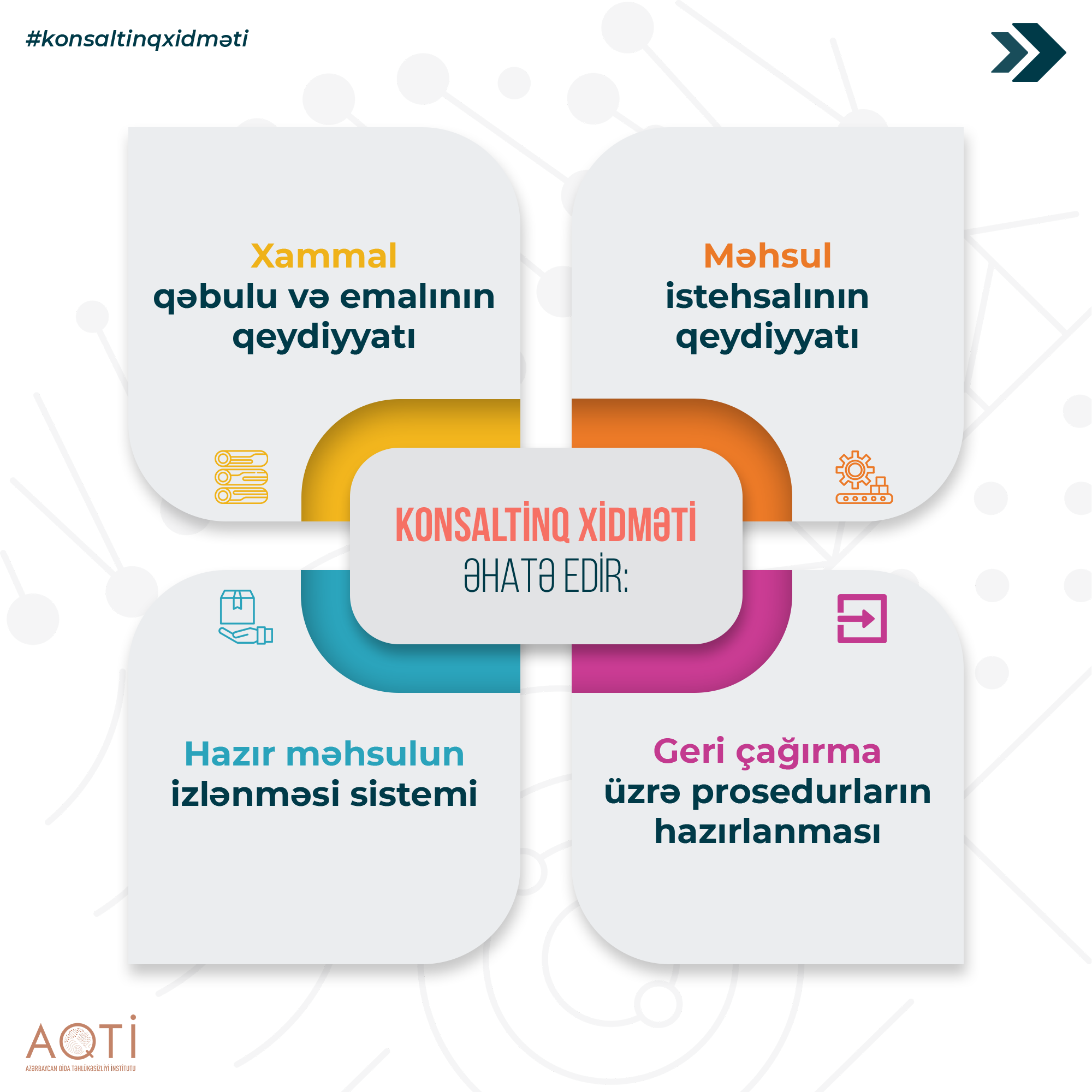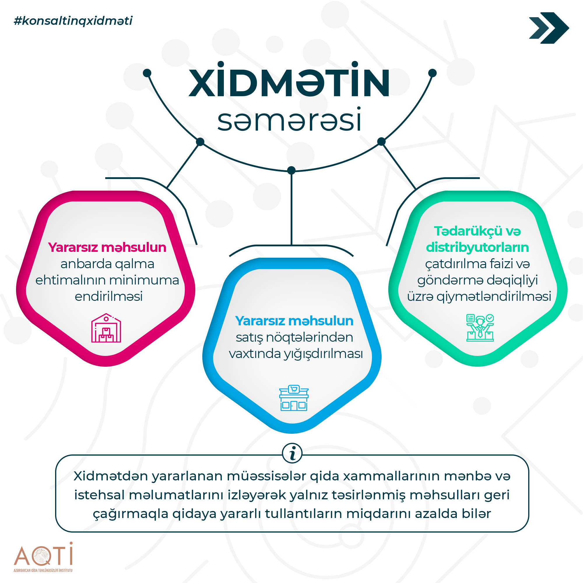 Qeyd edək ki, AQTİ qida sahəsində fəaliyyət göstərən sahibkarlıq subyektlərinə qida təhlükəsizliyinə dair elmi, texniki və praktiki konsaltinq, həmçinin qida təhlükəsizliyi göstəriciləri üzrə tədqiqat xidmətləri təklif edir.