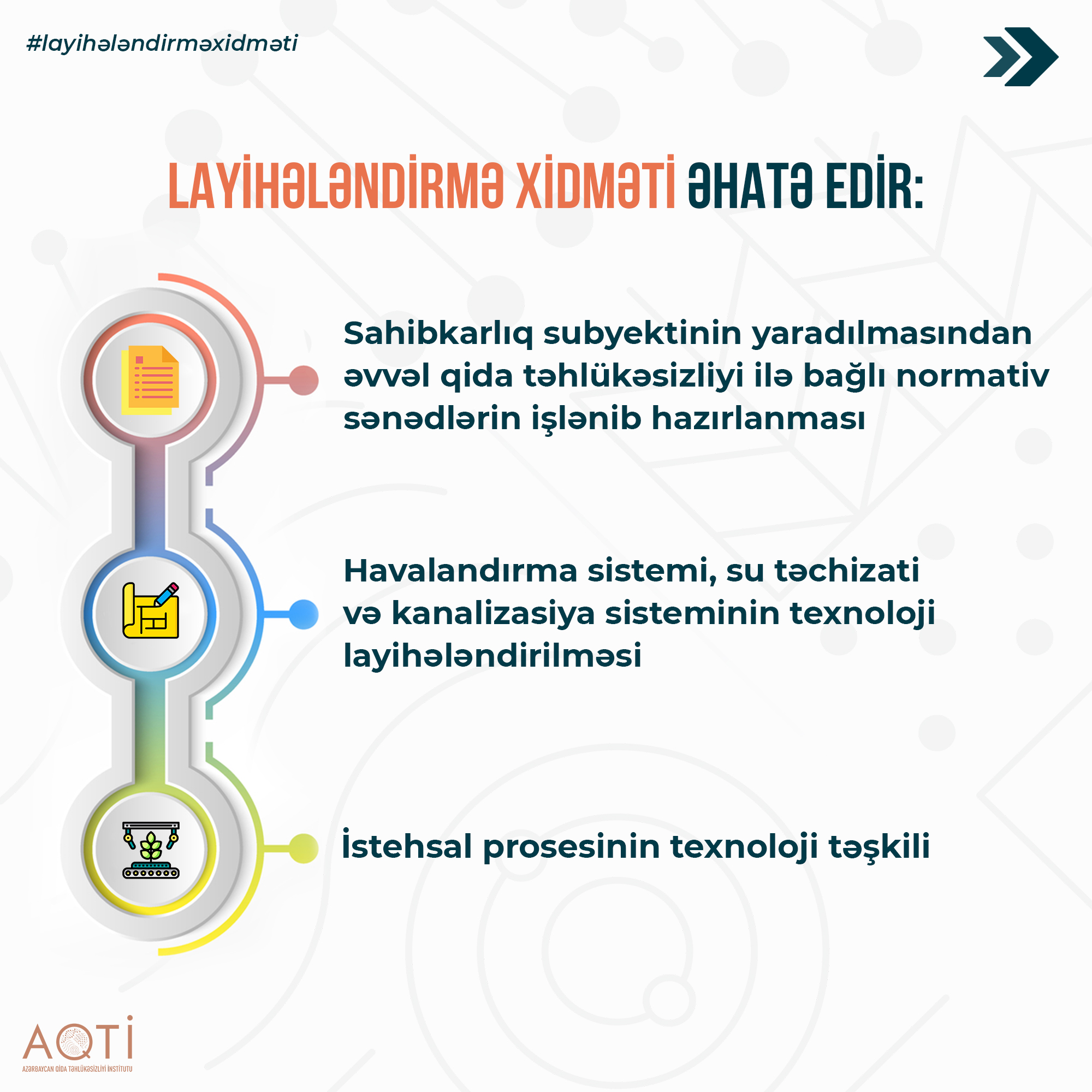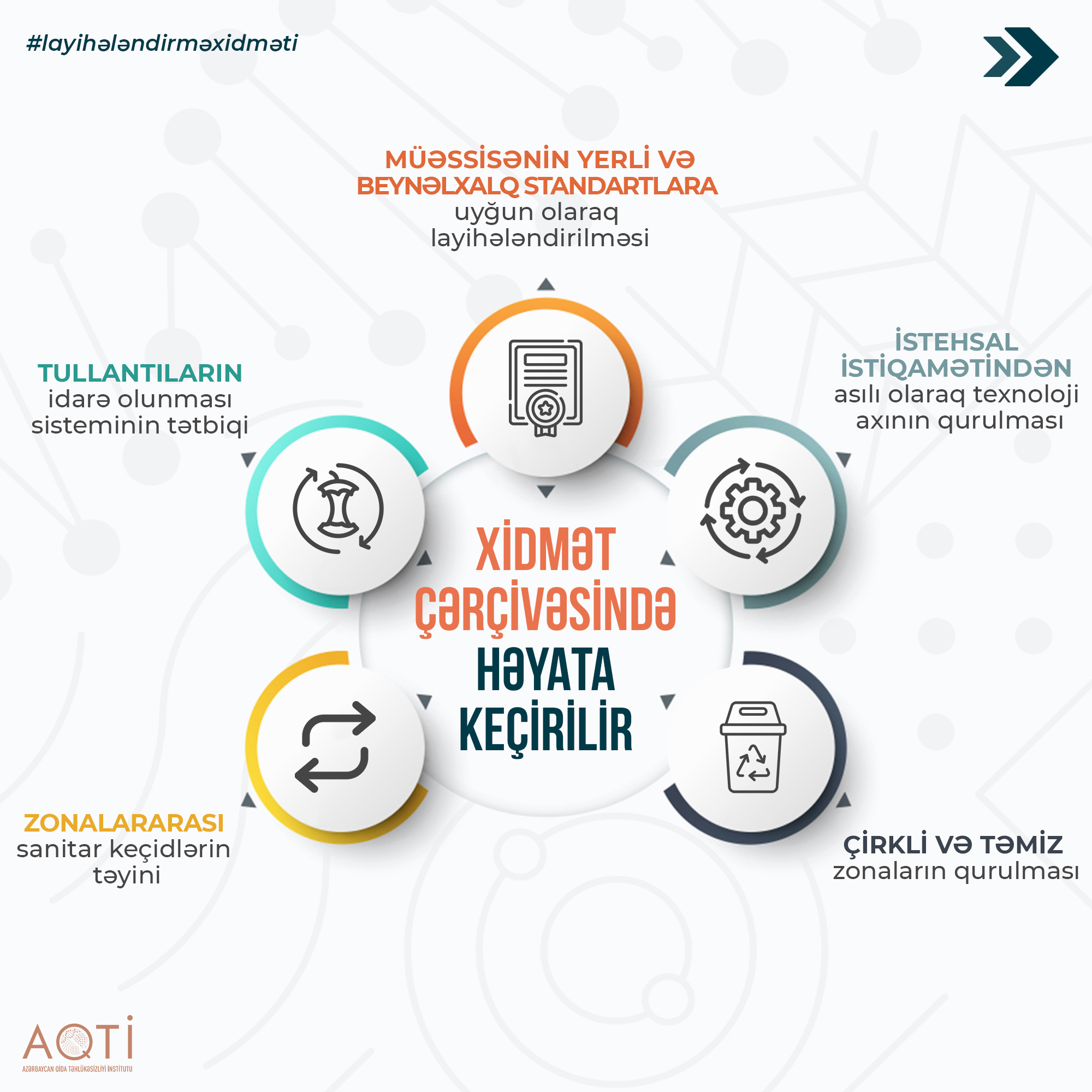 Peşəkar mütəxəssislər tərərfindən təklif olunan emal müəssisəsi, anbar, ictimai iaşə müəssisəsi və digər obyektlərin layihələndirilməsi zamanı bütün proseslərdə qida təhlükəsizliyinin qorunması, həmçinin layihənin beynəlxalq qida təhlükəsizliyi norma və aktlarına uyğunluğu təmin olunur. Qida emalı müəssisələrinin beynəlxalq və yerli qida təhlükəsizliyi qanunvericiliyi normaları üzrə layihələndirilməsi qida emalı üzrə əməliyyatların texnoloji ardıcıllığa uyğun qurulmasına imkan yaradır.