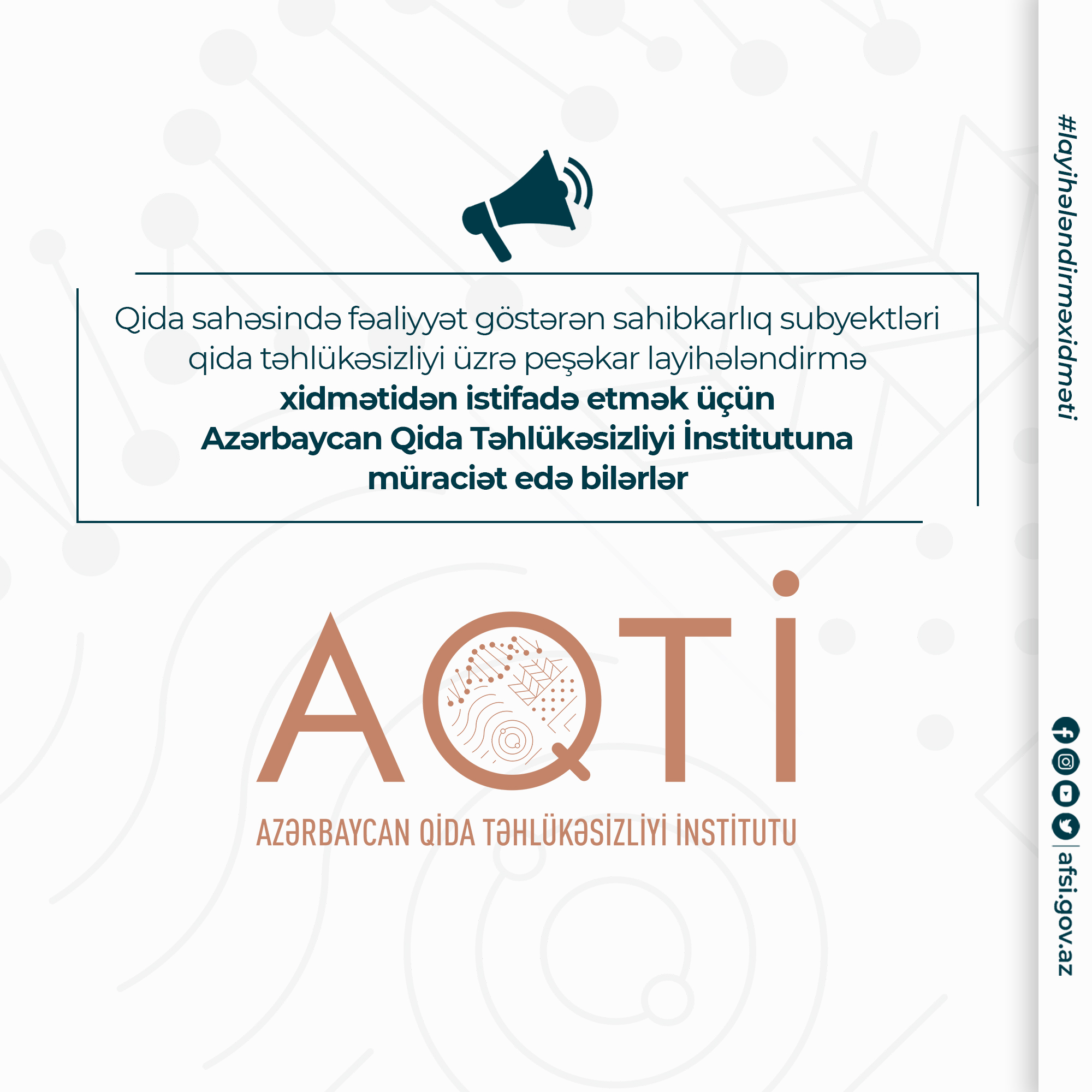 Qida sahəsində fəaliyyət göstərən sahibkarlıq subyektləri qida təhlükəsizliyi üzrə peşəkar layihələndirmə xidmətindən istifadə etmək üçün İnstitutun (012) 377 00 20 (daxili 553) nömrəli əlaqə vasitəsilə müraciət edə bilərlər.