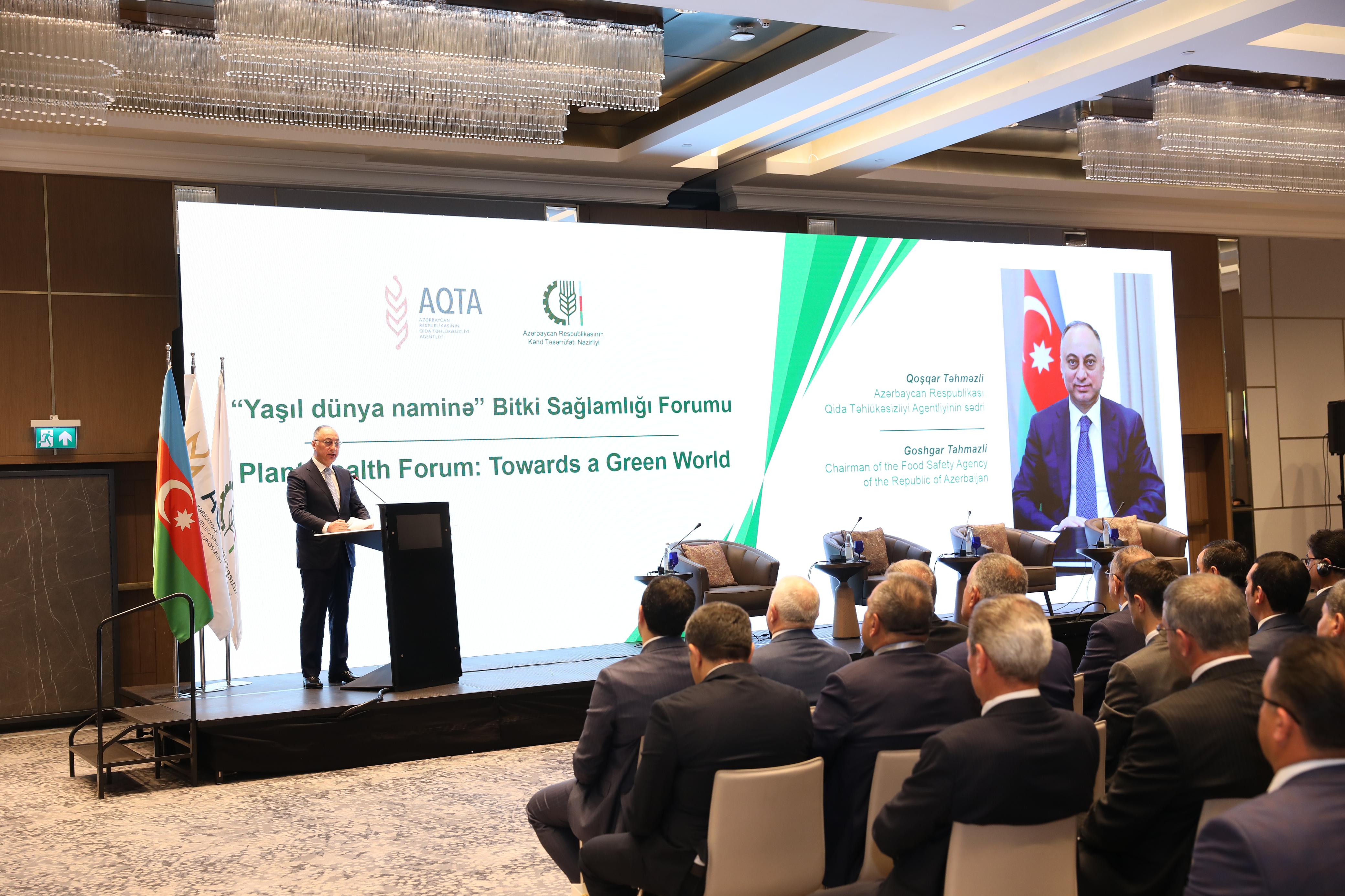 Qeyd edək ki, forum bitki və bitkiçilik məhsullarının zərərli orqanizmlərdən qorunması, mövcud zərərvericilərə qarşı mübarizə və onların idarə olunması yolu ilə bitki sağlamlığının möhkəmləndirilməsi, bitki və bitkiçilik məhsullarının istehsalı və təhlükəsiz ticarətinin genişləndirilməsi, qlobal ərzaq təhlükəsizliyinin və biomüxtəlifliyin qorunması üçün milli bitki sağlamlığı qurumları, regional və beynəlxalq təşkilatlar, dövlət qurumları, universitetlər və istinad laboratoriyaları üçün əməkdaşlıq platformasının təmin edilməsi məqsədilə keçirilib. Tədbirdə bir sıra dövlət qurumlarının, xarici ölkələrin və beynəlxalq təşkilatların nümayəndələri, ekspertlər iştirak edib, çıxışlar olub. Ölkəmizdə aqrar sahədə aparılan islahatlardan, bitkiçiliyin inkişafı istiqamətində görülən işlərdən və bu sahədə əldə edilən nailiyyətlərdən danışılıb. Respublikamızda bitki sağlamlığı sisteminin müasir çağırışlar nəzərə alınmaqla təkmilləşdirilməsi istiqamətində aidiyyatı qurumlar tərəfindən görülən işlər və nəzərdə tutulan hədəflər yüksək qiymətləndirilib. “Yaşıl dünya naminə” Bitki Sağlamlığı Forumunun ölkəmizdə və regional miqyasda bitki sağlamlığının, bununla da ərzaq təhlükəsizliyinin təmin olunmasına töhfə verəcəyinə əminlik ifadə edilib.