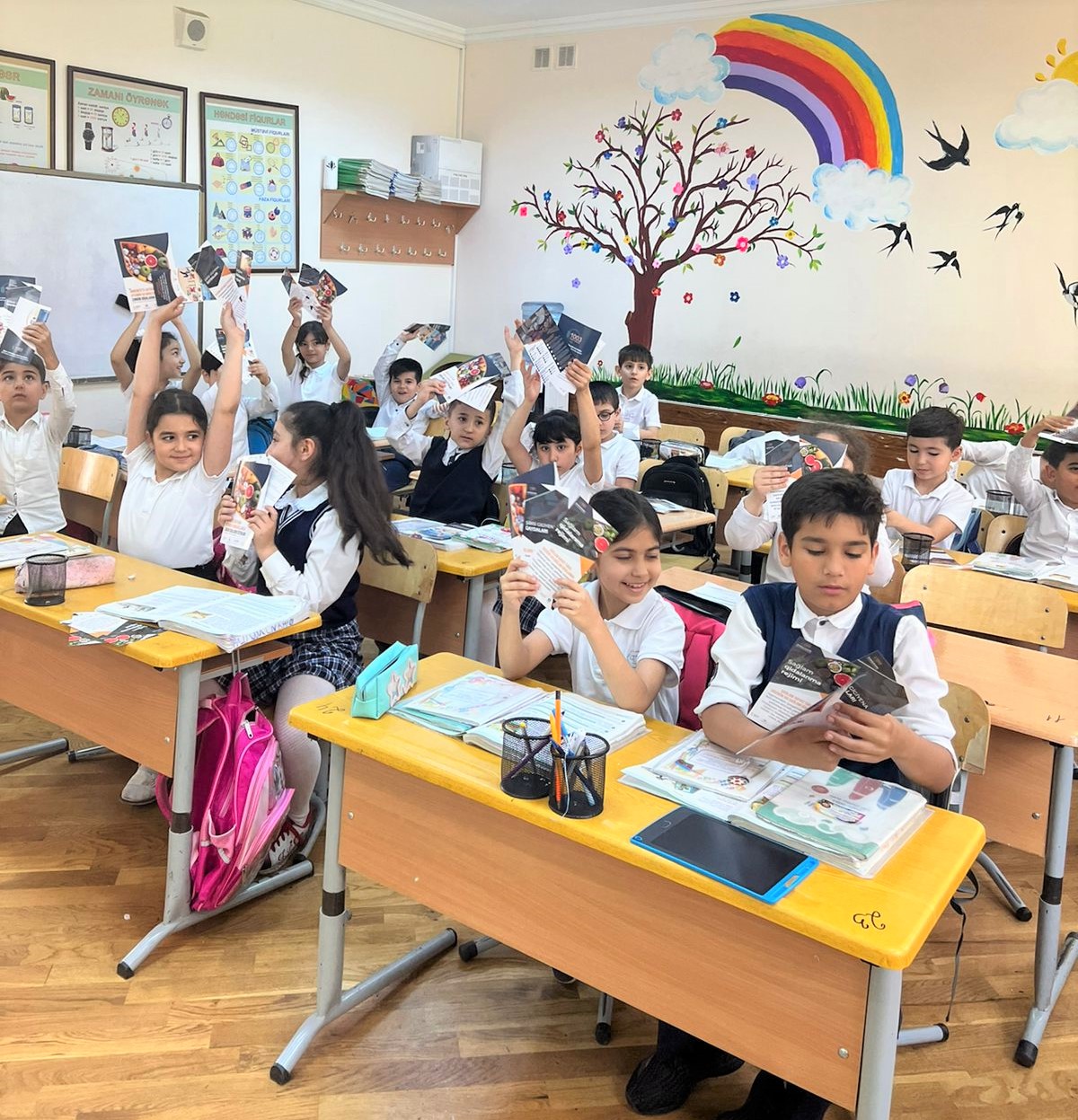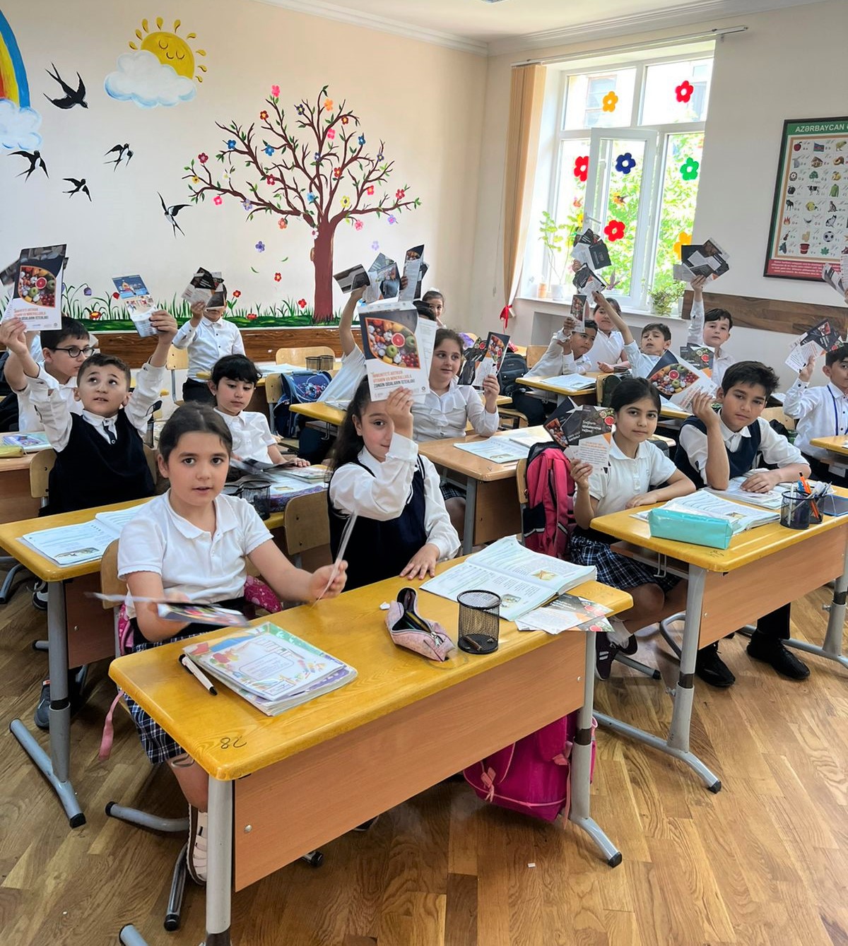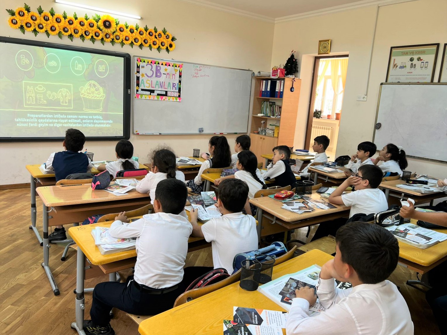 Daha sonra məktəblilərin qida bələdçiləri tərəfindən təhsilalanlara “5 addımda qida təhlükəsizliyi”, “Konservləşdirilmiş qidalar”, “Bakteriya mənşəli qida zəhərlənmələri”, “Qida məhsullarının etiket məlumatları” mövzularında broşürlər paylanılıb.
